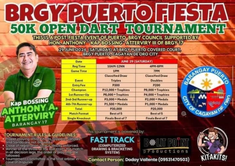 Organized by Edwin Dalusong, P30K Boyet Alava & Marlon Ortega Birthday Dart Tournament will be held from July 21, 2024 at Amayah Food Park, Binan City, Laguna. The event is an Open Dart Tournament. Supported by: Amayah Food Park.
