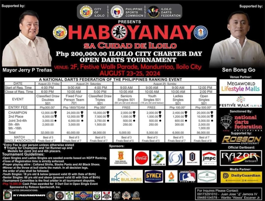 Organized by Tioco Darters & DarteroNgPinas Online Shop, P10,000 Tioco Darters & DarteroNgPinas Online Shop Open Darts Tournament will be held from July 14, 2024 at Tondo Food Park Gagalangin Pampanga St. Gagalangin Tondo Manila.