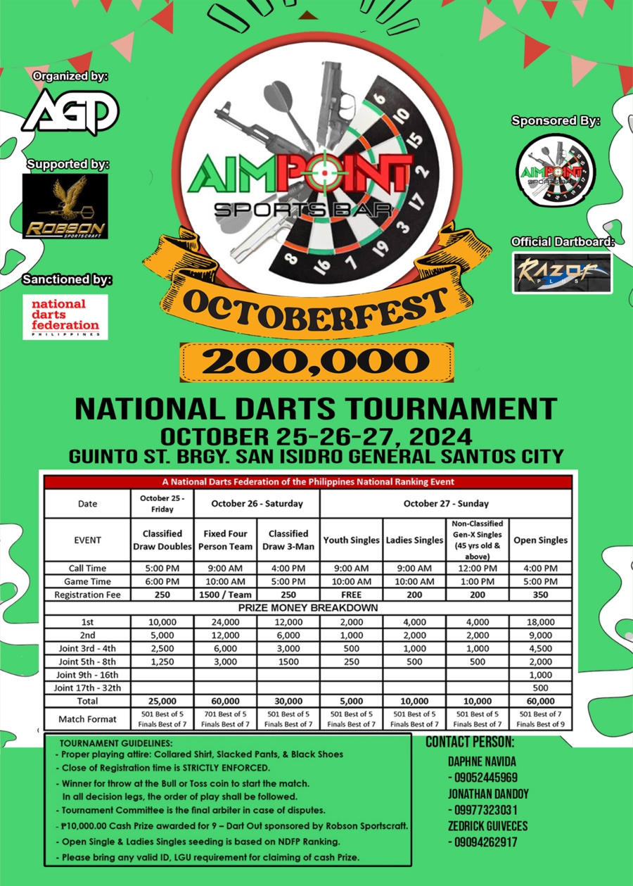 Organized by Agendarts, P200,000 Aimpoint Sports Bar National Darts Tournament will be held from October 25-27, 2024 at Guinto St., Brgy. San Isidro, General Santos City.